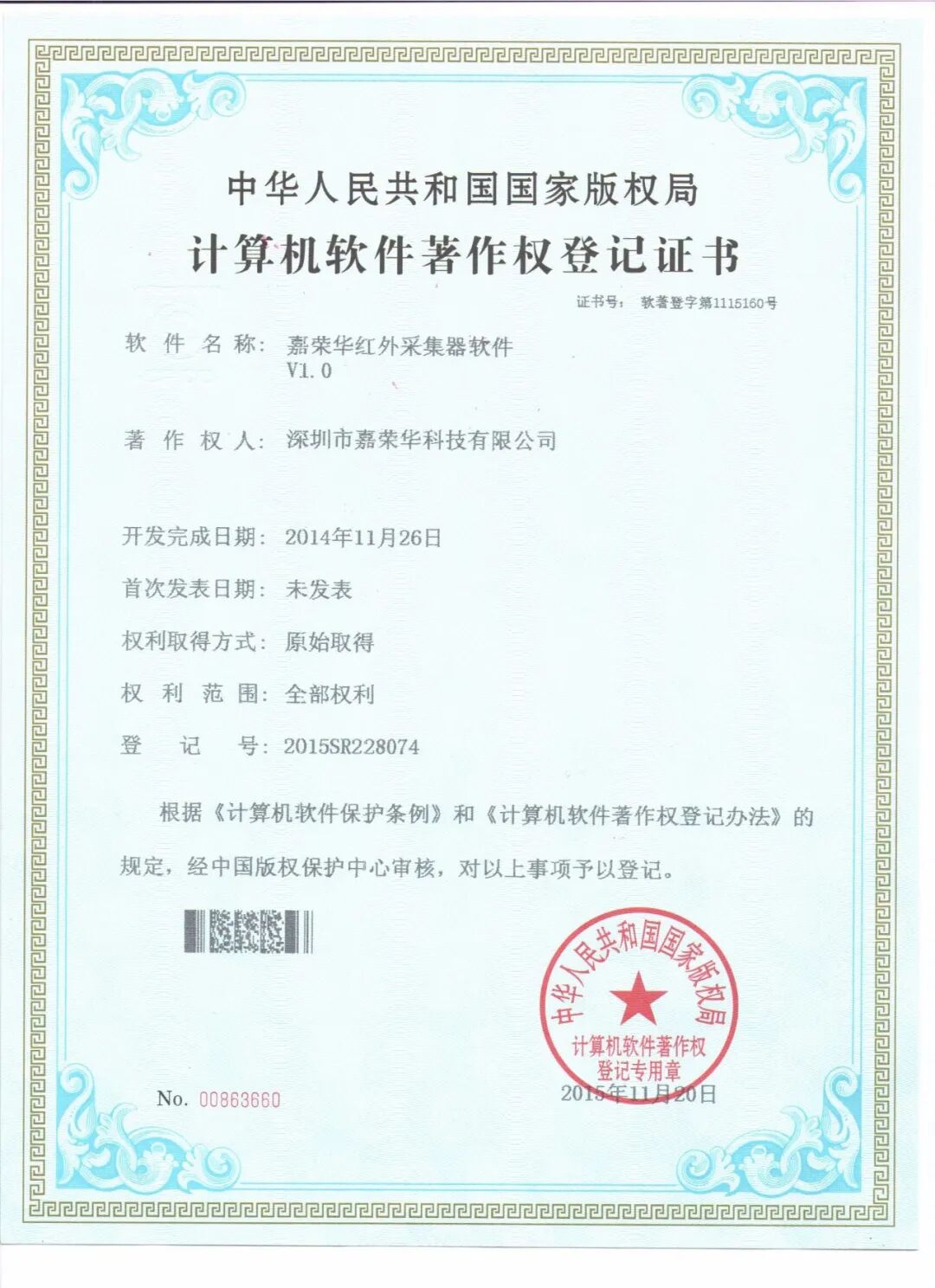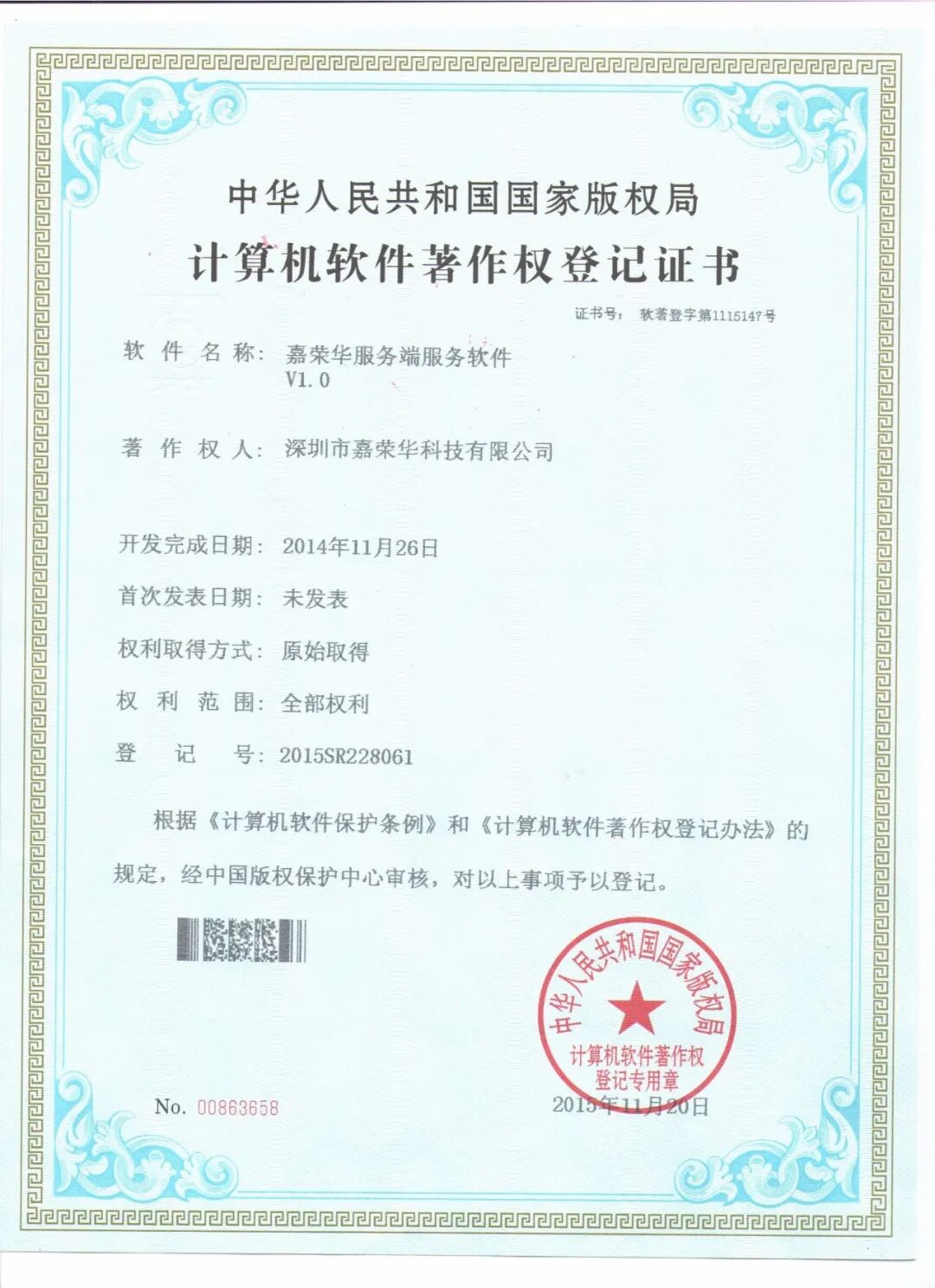 2012年12月11日,“互联网+智能抄表管理软件”取得了国家版权局颁发的计算机软件著作权等级证书,实现了嘉荣华科技技术管理成果零的突破。